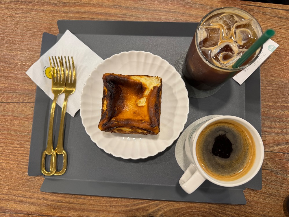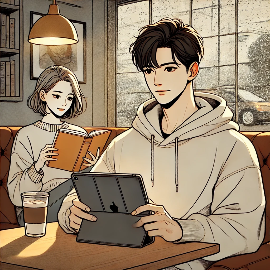 카페에 들어가 치즈케이크와 커피를 주문한 후, 자리에 앉아 아이패드를 꺼냈습니다.