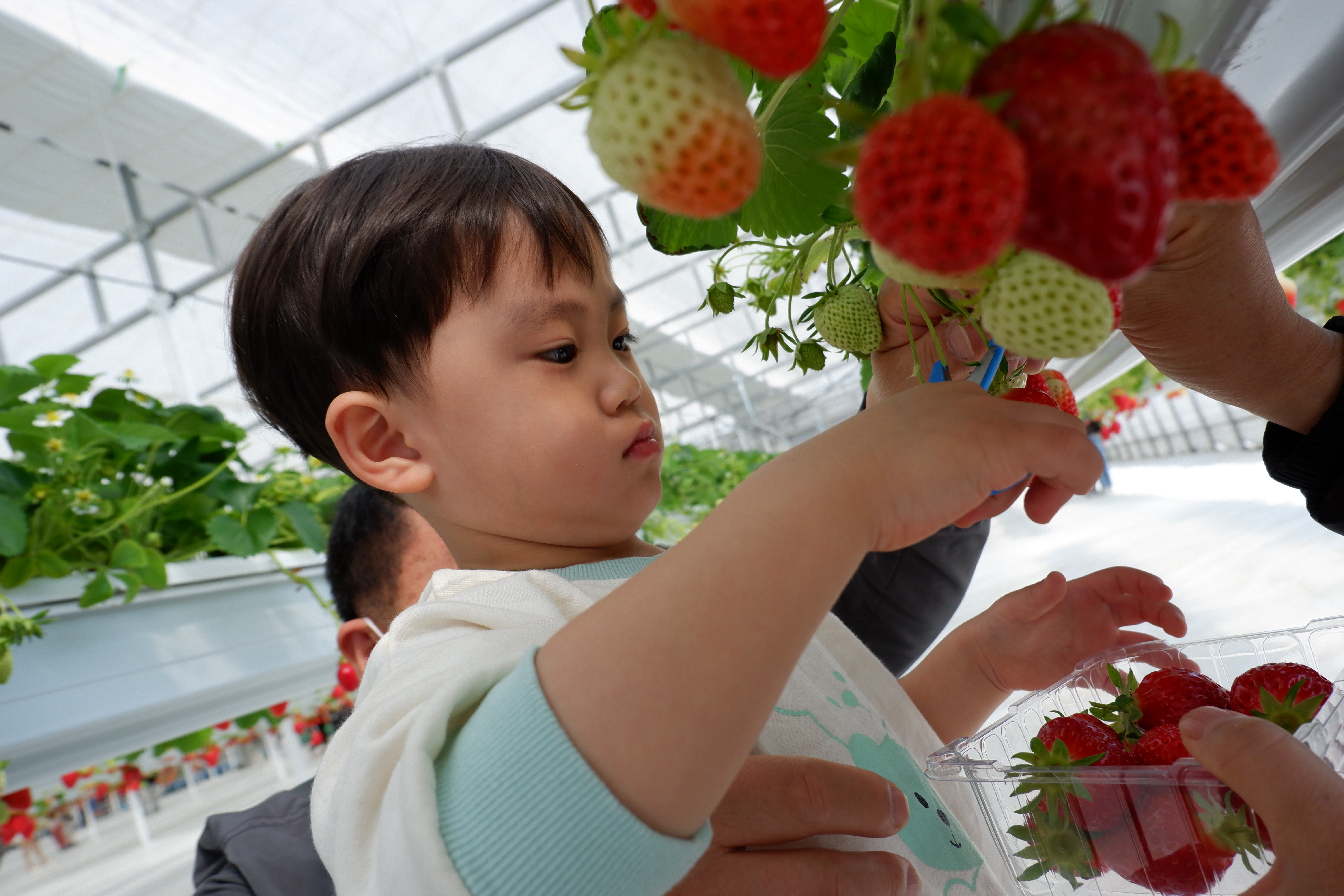 딸기 체험이라고 해서 대략 10팀 정도 예약을 했을거라고 생각했던 저의 생각과 달리, 굉장히 많은 사람이 함께 하게 되어서 놀랐습니다. 먼저 출발해서 자리를 잡고 있다가 아버지와 어머니께서 도착하시고 나서 딸기 체험을 시작했습니다. 2시간 동안 이용이 가능하고, 딸기체험 중에는 딸기를 먹을 수 없으며, 플라스틱 용기 1개 정도를 체험할 수 있다는 설명을 듣고, 두근거리는 마음으로 비닐하우스에 입장했습니다. 생각보다 굉장히 깔끔하고, 체험하기 좋게 되어 있어서 아들의 고사리 같은 작은 손으로도 딸기 체험을 재미있게 할 수 있었습니다. 딸기선별사 역할을 맡으신 아버지와 어머니께서 예쁜 딸기를 골라주셨고, 아들은 나름 진지하게 딸기를 수확했습니다. 중간에 쉬 마렵다고 해서 또 불티나게 아들을 안고 화장실로 달려가는 해프닝도 있었지만, 아들에게 좋은 경험을 하게 해 주었다는 생각에 뿌듯하기도 했습니다. 조금 아쉬웠던 건, 딸기를 왕창 먹을 수 있을 거라고 생각했던 것과 달리 체험 중 시식이 금지되었다는 점, 그리고 생각보다 플라스틱 용기가 작다는 점 정도였습니다.
