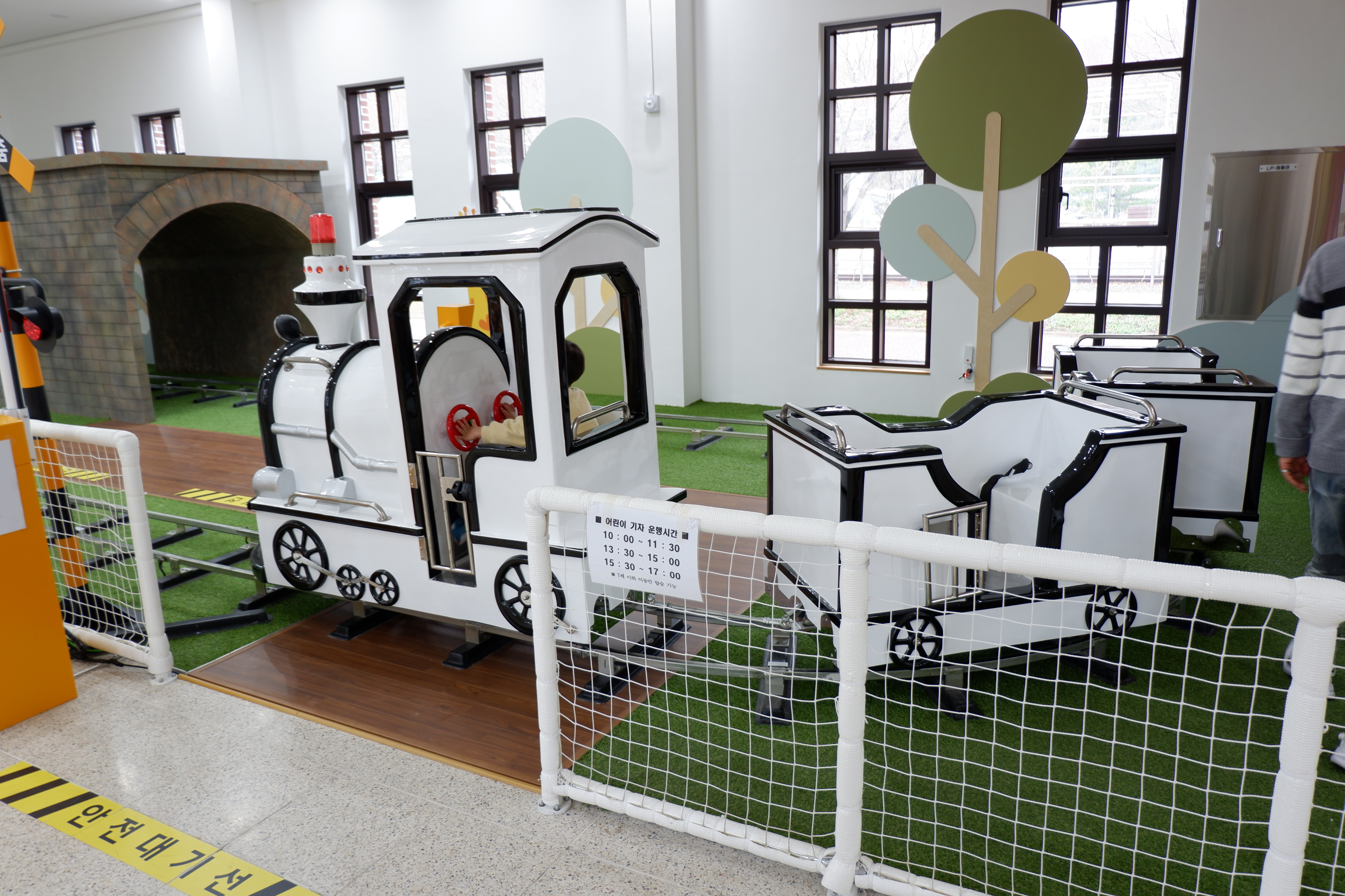 비가 오기도 했고, 레일바이크는 광주에 사시는 아버지와 어머니가 도착하시면 함께 탈 예정이었기 때문에 영산포역사 옆에 있는 실내놀이터에 들어갔습니다. 실내놀이터에는 독서를 할 수 있는 공간과 암벽등반 및 미끄럼틀로 이용되는 공간, 그리고 대망의 '어린이 기차'가 있습니다. 목포 근교의 키즈카페를 가보면 이런 방식의 기차가 있기는 하지만 1번밖에 탈 수가 없고 더 타고 싶다는 아들을 달래기 참 어려웠는데, 이곳은 무료인 데다가 이렇게 사람이 없을 경우에는 여러 번 탈 수가 있다는 점점이 상당히 매력적입니다. 사진을 보시면 어린이 기차 운영시간이 있는데, 하루에 1시간 30분씩 3번 운영하고 있으며 이는 레일바이크의 시간과도 일치합니다. 시간 참고하셔서 오시면 정말 좋을 것 같아서 추천합니다.