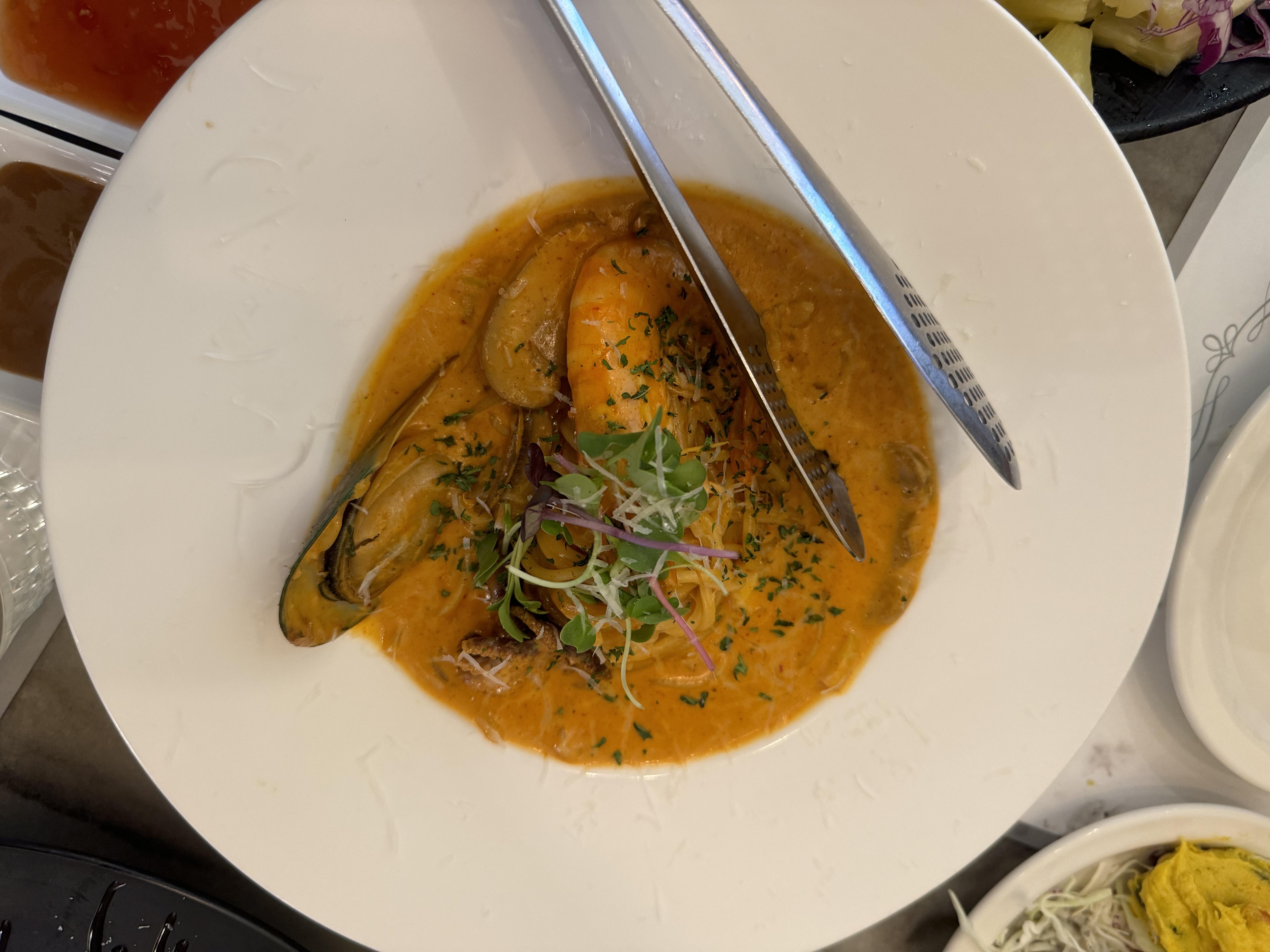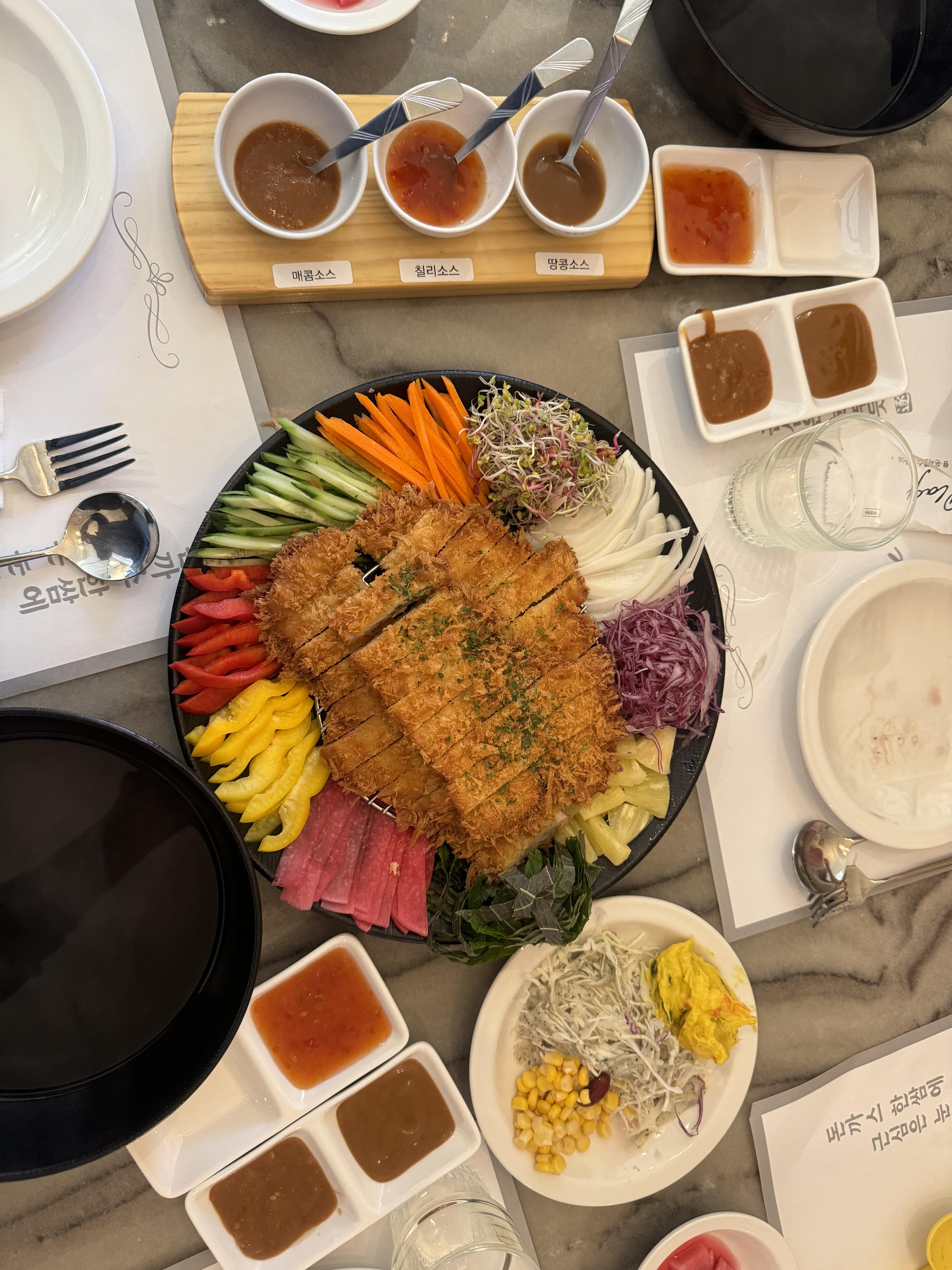 항상 식사를 고를 때마다 쉽지 않다는 것을 느낍니다. 뭐든 괜찮다고 하시지만, 아들과 부모님을 동시에 만족시키는 식당을 찾기란 항상 어렵습니다. 플라쥬는 이 모든 것을 만족시킨 곳이었습니다. 메뉴를 보고 쌈 돈가스(2인분, 34000원)와 매콤해산물크림파스타(17000원), 그리고 큐브스테이크볶음밥(16000원)을 주문했습니다. 샐러드바를 무료로 이용할 수 있었기 때문에 메뉴가 나오기 전 샐러드를 먹으며 본격적으로 점심 식사를 할 준비를 했습니다. 미술적 감각이 부족한 저에게도 플라쥬의 인테리어는 보기 참 좋다는 생각이 들게 만들었습니다. 개인적으로 1층보다는 2층이 뷰가 좋기 때문에 추천합니다.