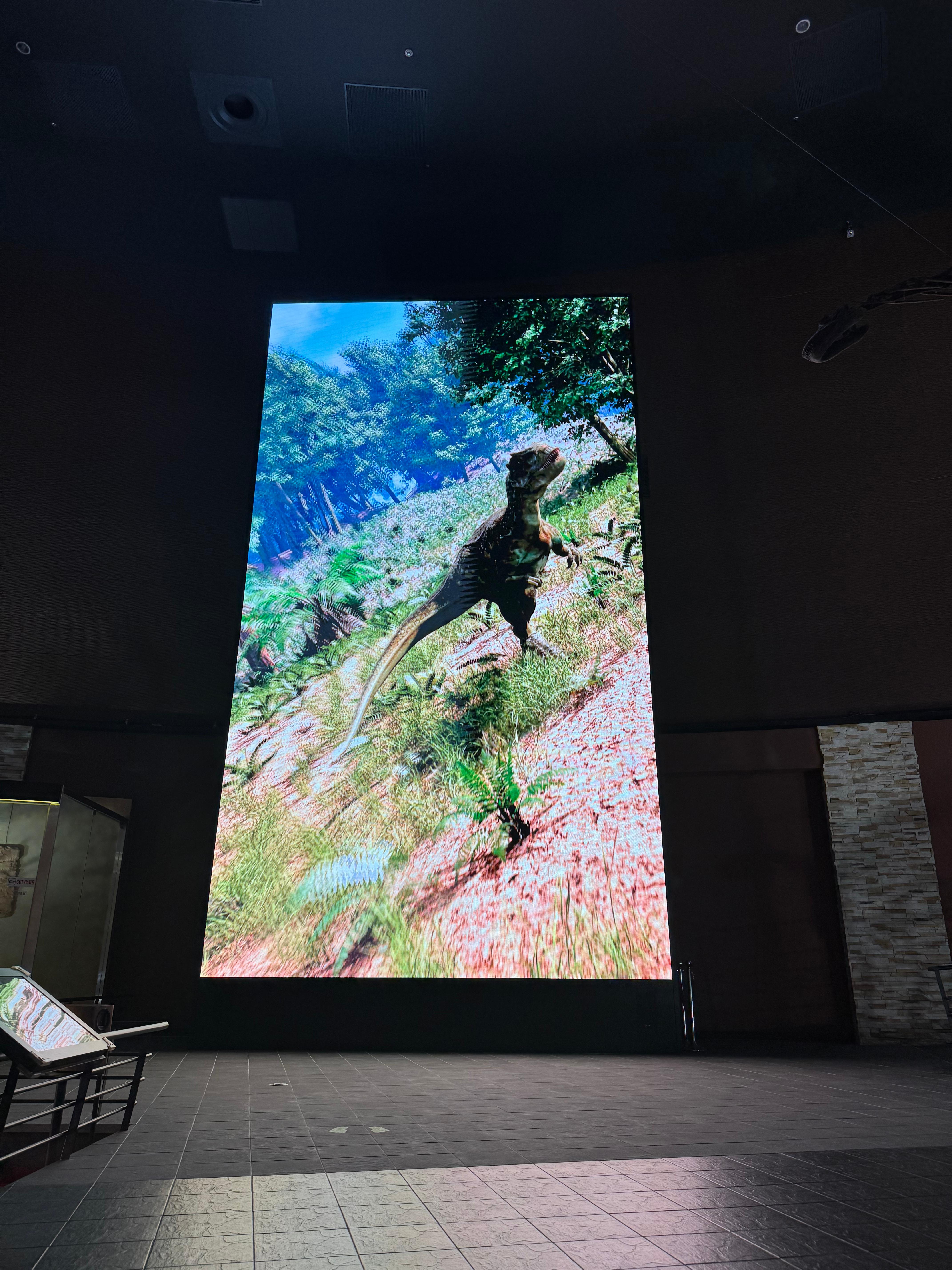 작년에 방문했을 때는 못 봤던 것 같은데, 대형 스크린이 설치되어 있었습니다. 스크린 앞쪽에는 간단히 앉을 수 있는 곳이 마련되어 있었고, 저희 가족은 그곳에 앉아 마치 영화관을 빌린 것처럼 반복해서 영상을 시청했습니다. 영상은 박물관에 있던 알로사우르스가 살아나 예전 공룡시대의 초원을 동료들과 함께 탐험하는 이야기였는데, 생각보다 영상 퀄리티가 너무 좋았습니다. 아들은 처음에는 호기심으로 보다가, 육식공룡이 초식공룡을 사냥하는 모습을 보던 중 갑자기 무섭다면서 집에 가자고 했습니다.