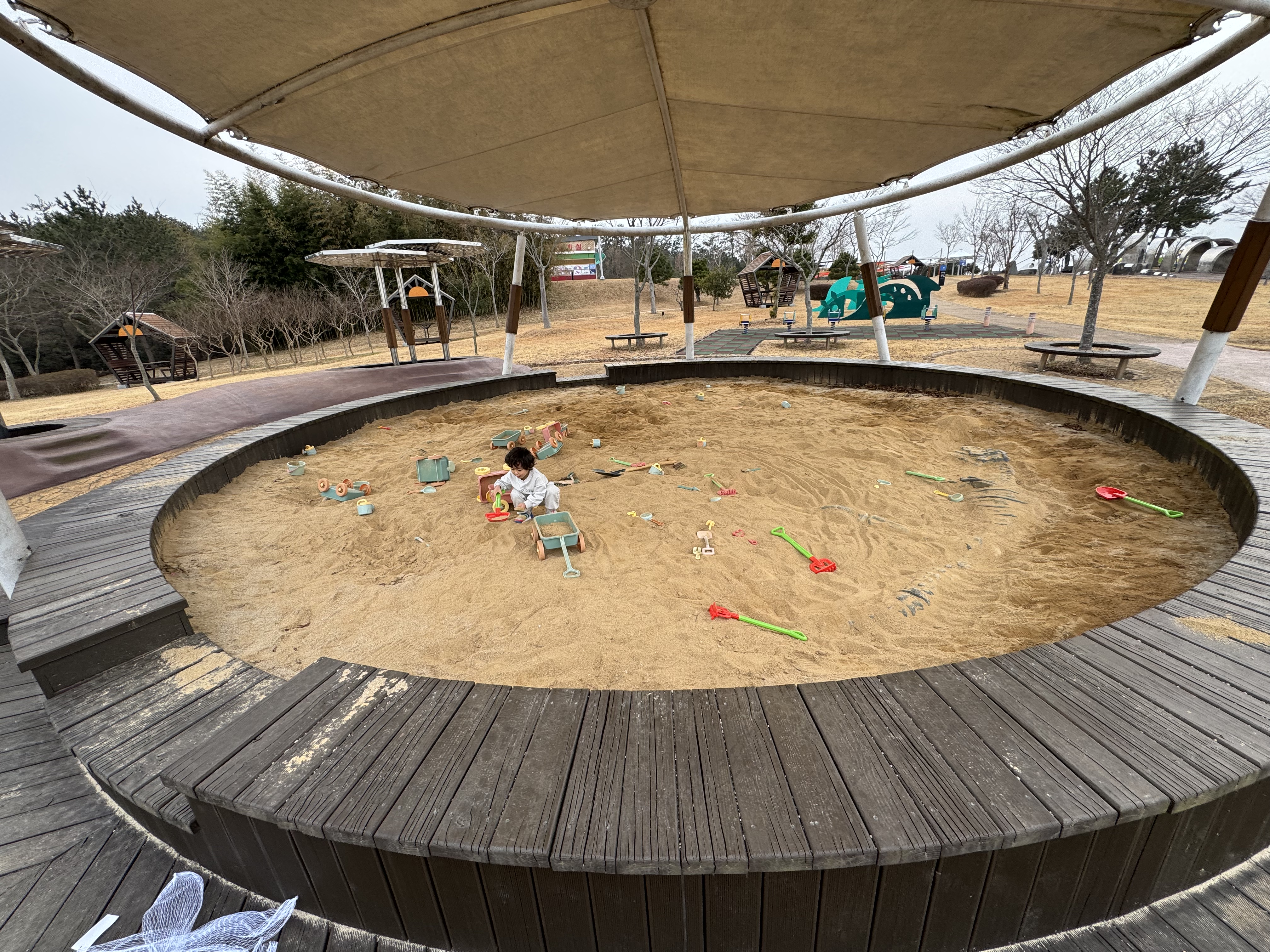 큰 모래놀이터를 발견한 아들은 바로 외투를 벗었습니다. 중간에 자리를 잡고 앉아 모래를 만지고 놀면서 너무 즐거워했습니다. 날씨가 그래도 쌀쌀한 편이라 걱정했지만, 아들은 아랑곳하지 않고 씩씩하게 놀았습니다. 모래놀이를 마치고 난 후에는 주변에 있는 시설들을 하나씩 체험하며 시간을 보냈고, 계속 안아달라고 하는 아들을 조금 안아주다가, 너무 힘들어서 아들에게 도둑과 경찰 역할놀이를 하자고 꼬셔서 겨우 주차장에 도착했습니다. 집에서 저녁을 먹기로 하고 목포로 향하는 길에 아들은 엄마 품에서 그대로 잠이 들었습니다.