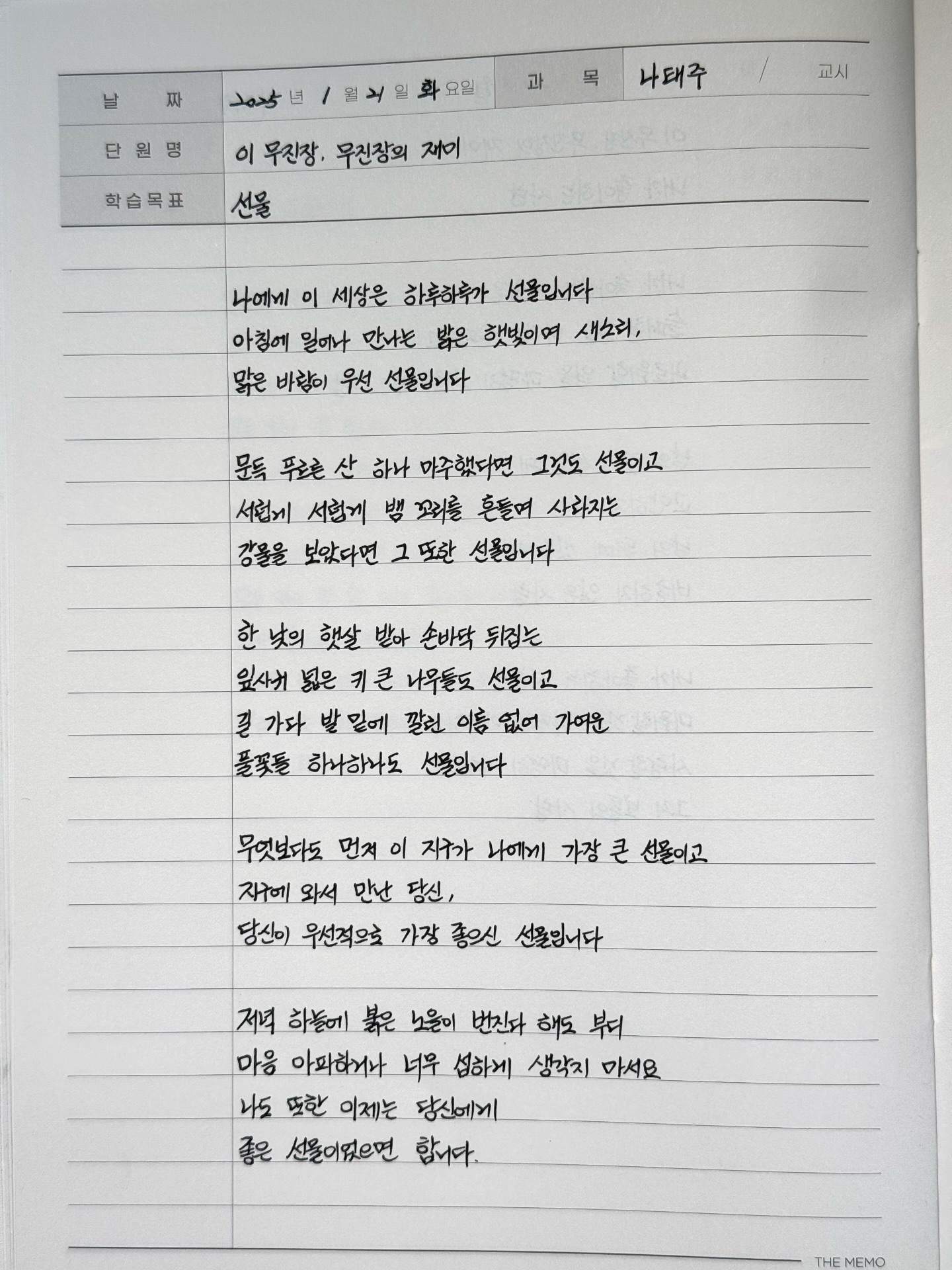 첫 번째 변화로 필사를 시작했습니다. '나는 매일 필사를 하며 나 자신에게 지성과 긍정의 마음을 선물합니다.'라고 말씀하신 김종원 작가님의 필사는 참 매력적인 활동임을 매일 느낍니다. 고등학교를 졸업하고 20년 정도의 세월 동안 저를 위해서 글을 적은 적은 거의 없었습니다. 누군가에게 마음을 전하거나, 선생님으로서 일기 검사를 하고 피드백을 해 주거나, 가끔 칠판 판서를 해야 할 때 정도에만 글을 썼습니다. 필사를 처음 시작했을 때에는 짧은 시를 썼음에도 불구하고 손이 너무 아팠습니다. 하지만 필사를 하는 시간은 온전히 저를 위한 시간이었고, 글의 의미를 생각하다 보면, 그와 관련된 많은 추억과 이야기들이 제 머릿속에 떠올랐고, 필사를 마친 후 조금 더 단단해진 마음을 느꼈습니다. 그래서 앞으로도 필사를 꾸준히 할 생각입니다.
